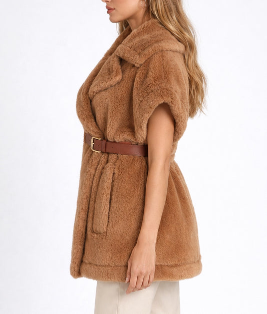 A brown faux fur jacket has a warm, earthy tone. It's versatile and works well with many different outfits.