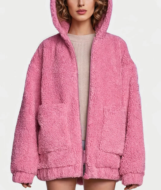 Want something fun? A pink faux fur jacket adds a pop of color to make a statement.