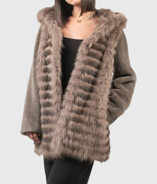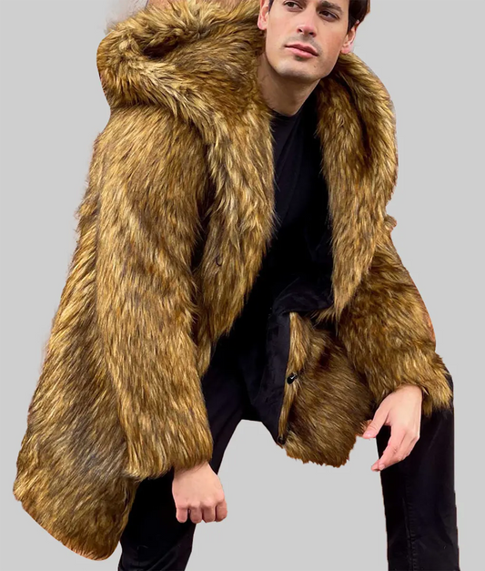 Scabby Men Brown Coyote Hooded Faux Fur Coat