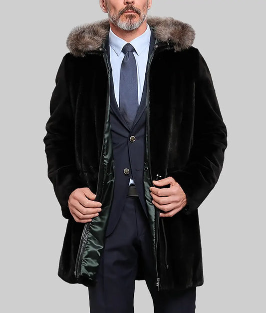 Shelby Men Black Mink Fur Coat With Russian Sable Stripe On Hood