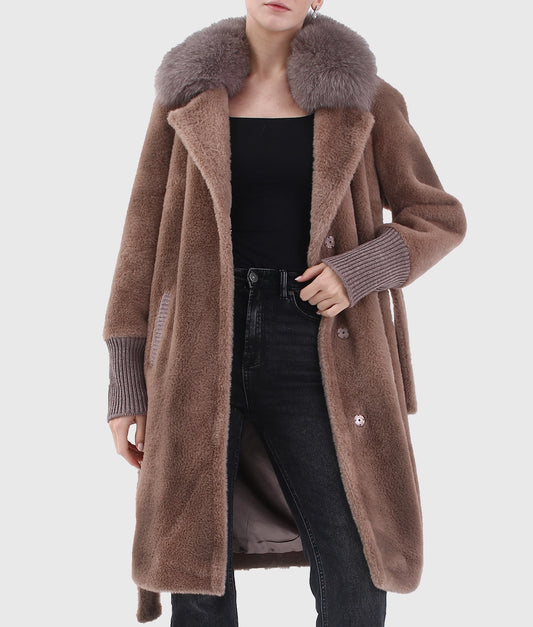 Ulsa Women Brown Lamb Fur Coat Trim With Fox Fur Collar