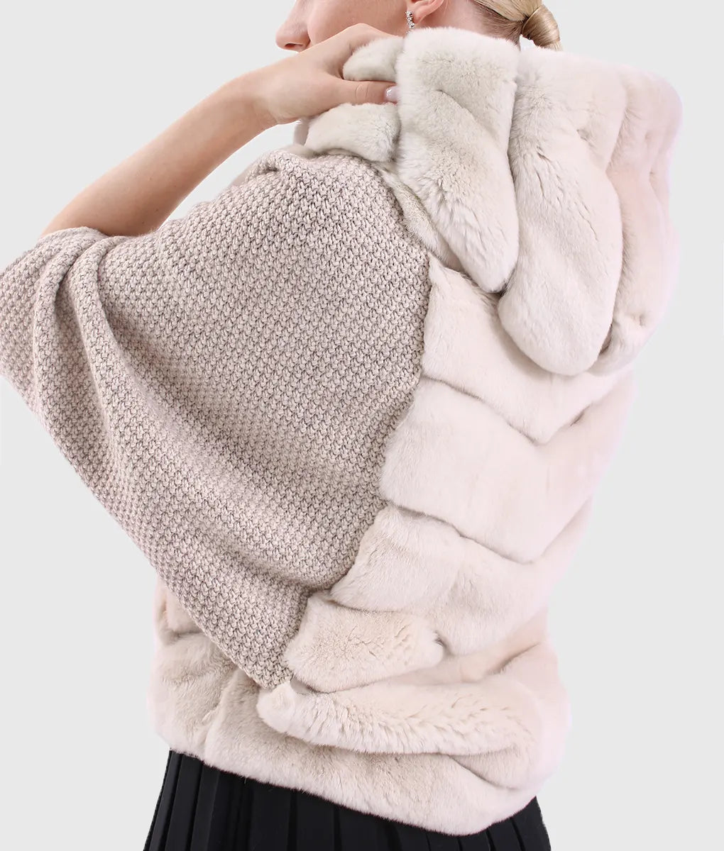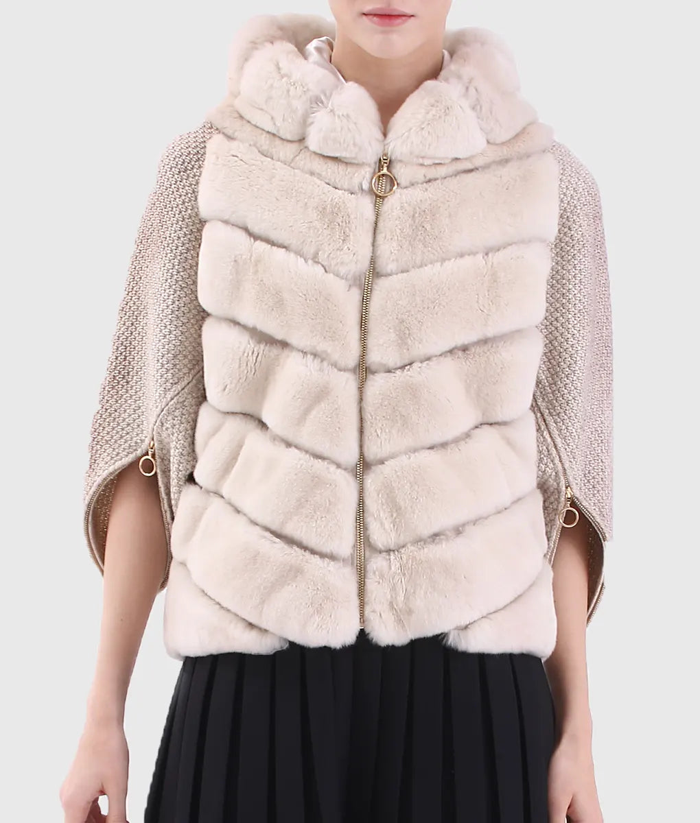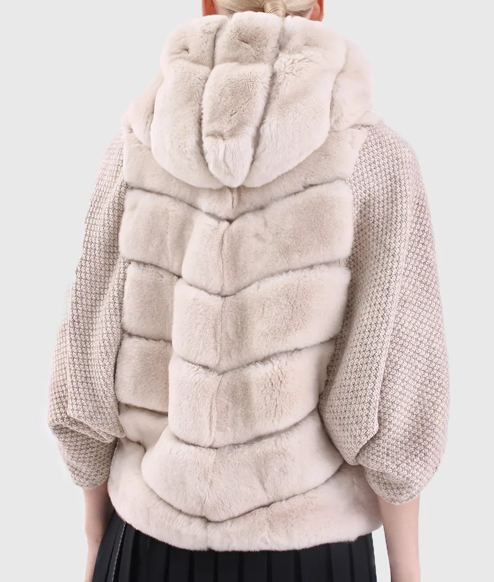 Meol Women White Rex Rabbit Fur Jacket With Hood