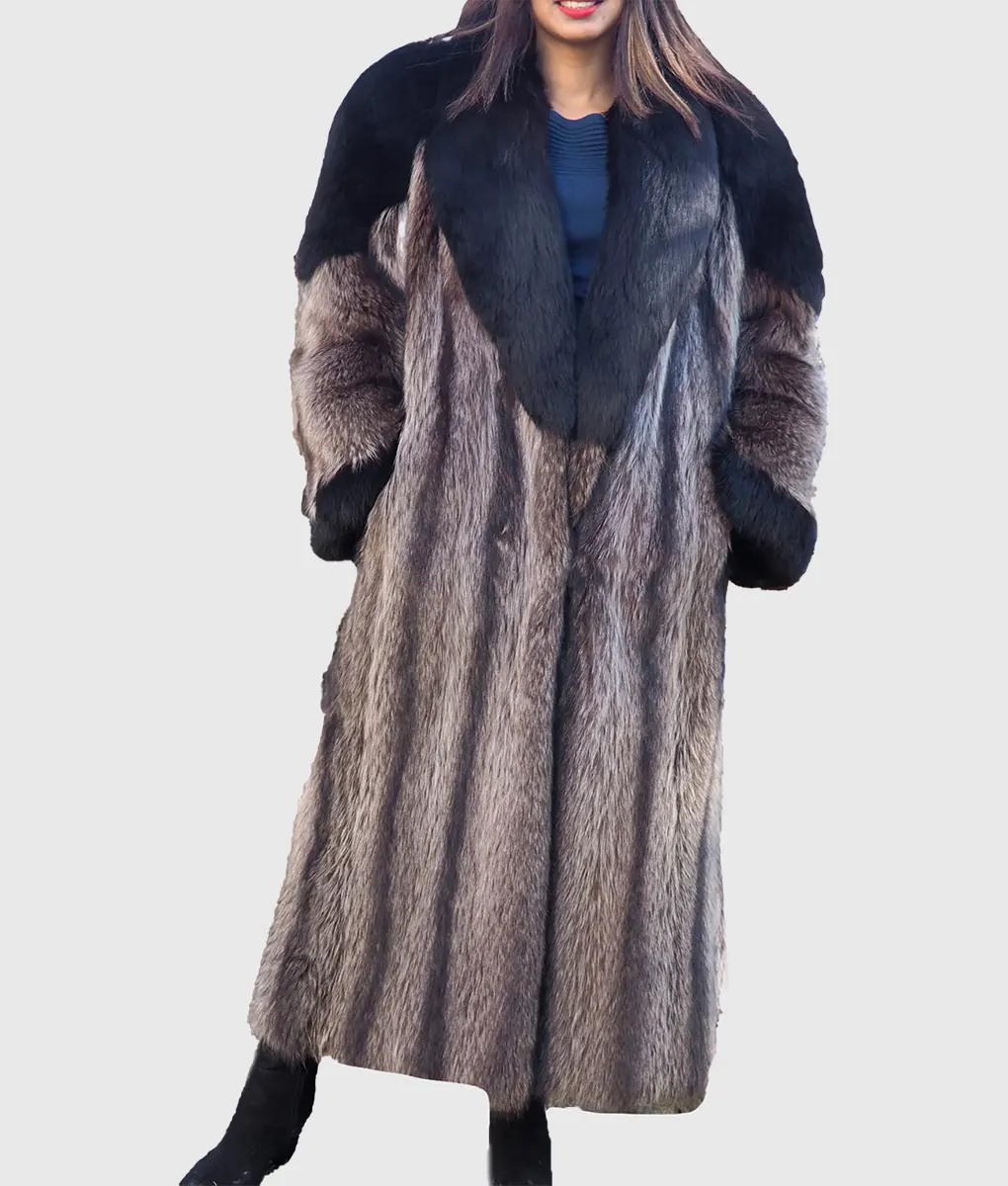 Seslie Women Brown Raccoon Fur Coat with Fox Trim